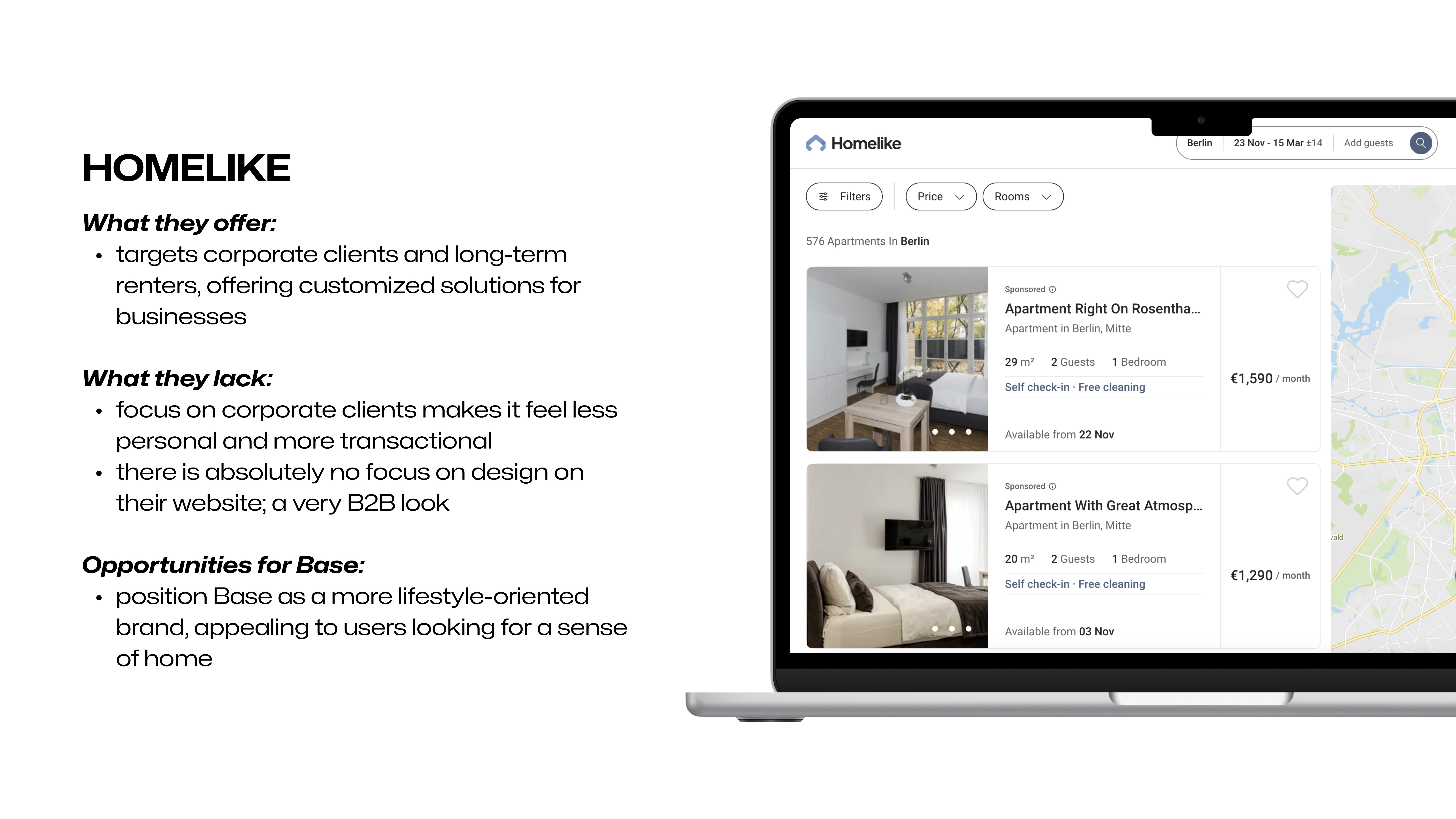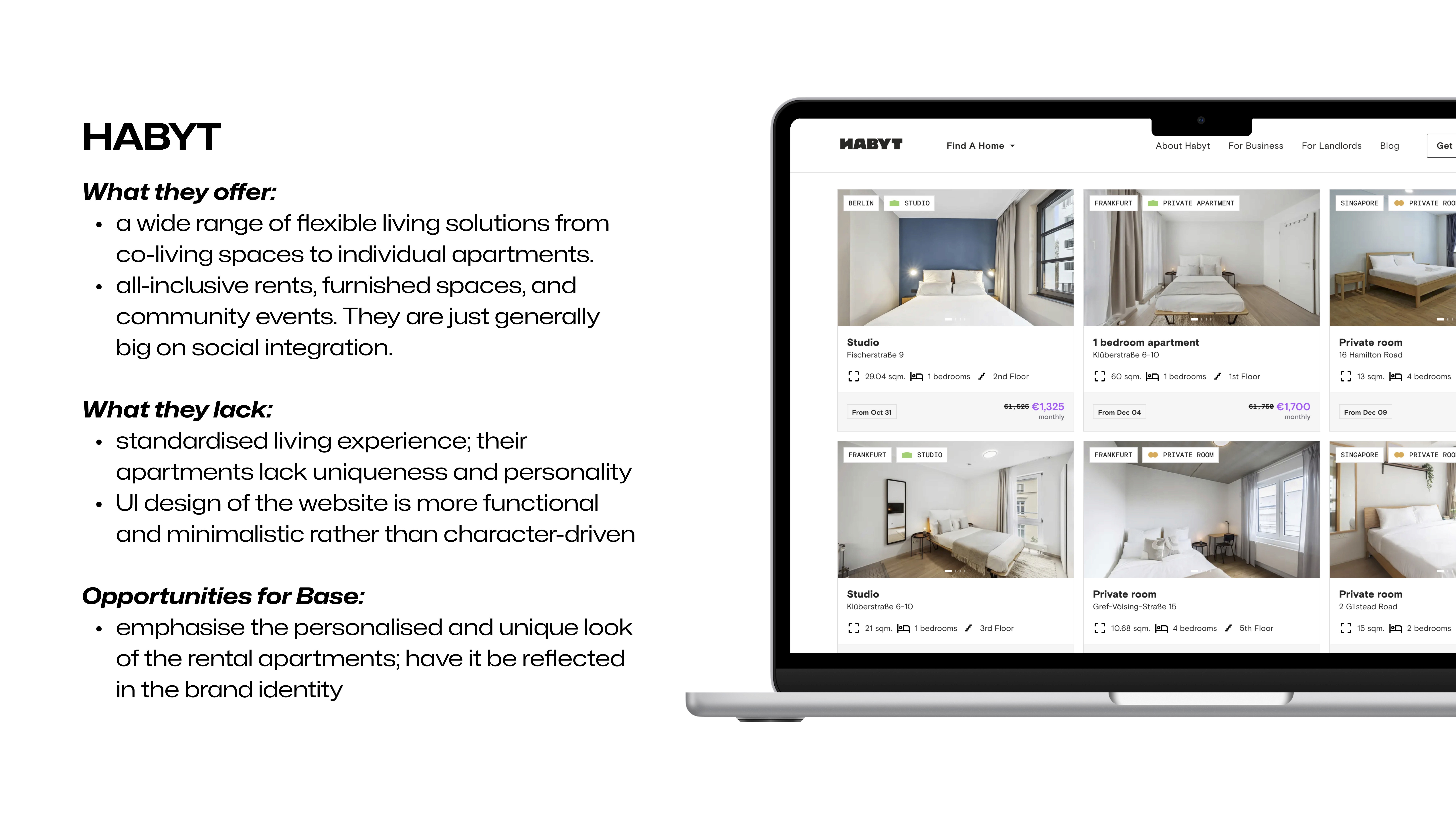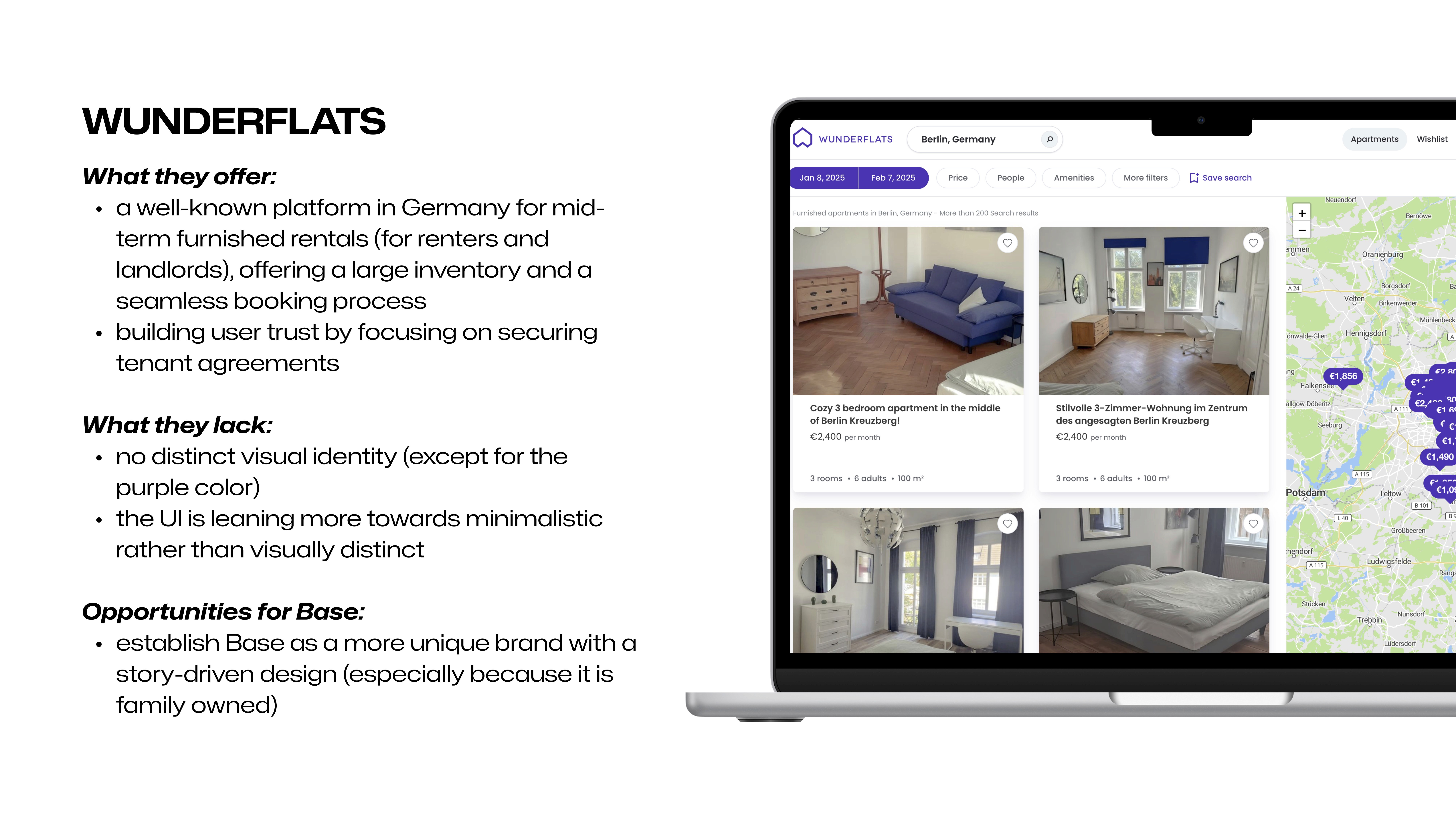 Established platforms like Wunderflats, Homelike, and Habyt are functional, but visually bland. I saw this as our chance to shine: by bringing a fresh, and alternative vibe into Base’s design, we could tell a more personal, engaging story and connect with people looking for a temporary home.