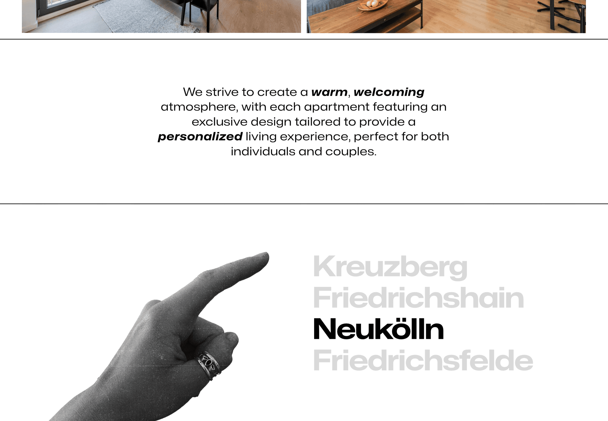 Being a family-owned business, I crafted a visual identity that truly reflects our unique character. Rooted in Berlin, with all rental properties located in some of the most sought-after neighborhoods like Kreuzberg, Neukölln, and Friedrichshain, it was essential to infuse the brand with the city’s iconic alternative vibe. The handwritten apartment names paired with wide typography create a striking balance between structure and chaos, capturing the essence of Berlin’s dynamic spirit.